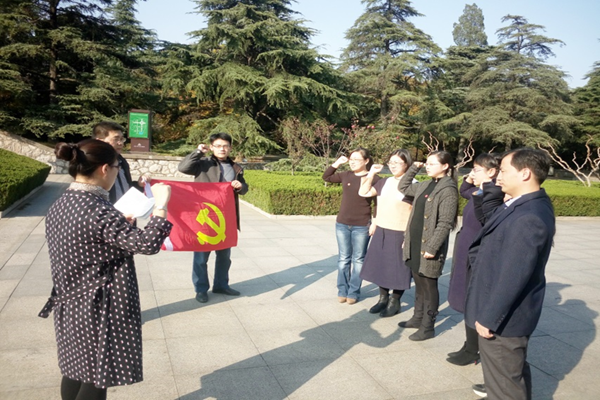 纪念塔下宣誓言。在党支部书记的带领下,党员们首先来到淮海战役烈士纪念塔前驻足瞻仰,表达对革命先烈深深地敬仰与哀思之情,支部书记张锋同志首先带领大家简单回顾了淮海战役的历史和党日活动的意义;随后,在庄严肃穆的纪念塔前,支部宣传委员芮怀瑾同志带领大家,面对鲜红党旗,重温入党誓词。铿锵有力的宣誓,向为在中国革命和解放事业中牺牲的先烈们表示深深的敬意,表达了党员们愿为人民事业奋斗终身的坚定信念;最后,优秀党员代表杜吴昊同志进行了发言,他说我们今天的美好生活是先烈们用鲜血和生命换来的,在今后的工作中,我们要从自己做起,发扬不畏艰难、吃苦耐劳的精神,增强责任感、使命感,发挥党员的先锋模范作用,勤奋学习,努力工作,为实现中华民族伟大复兴的中国梦努力奋斗。