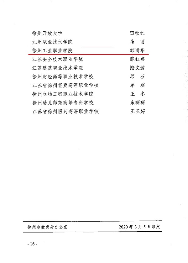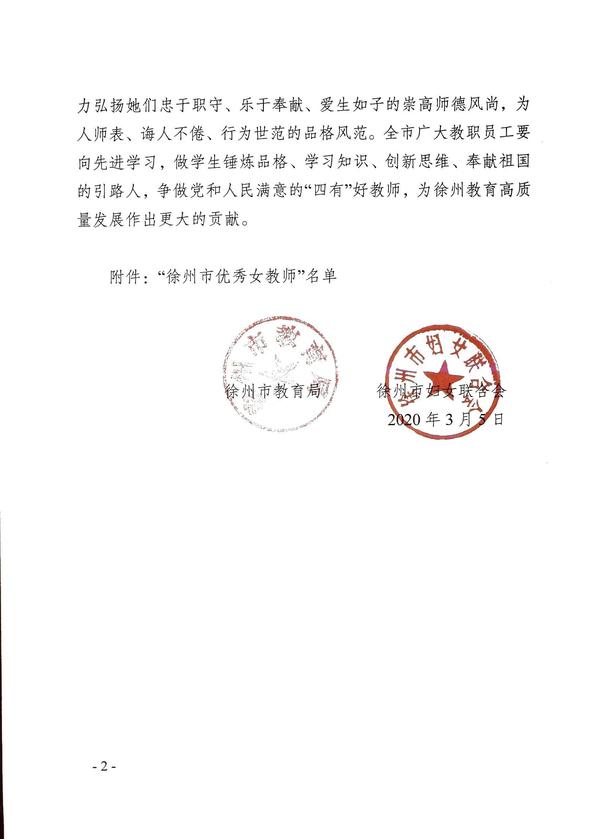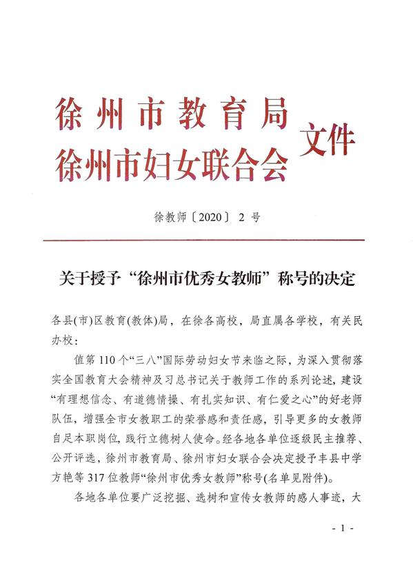 值第110个“三八”国际劳动妇女节来临之际,徐州市教育局、徐州市妇女联合会联合在全市范围内开展“徐州市优秀女教师”评选活动,经过逐级民主推荐、公开评选等程序,我校工商管理学院邹澍华老师荣获“徐州市优秀女教师”称号。