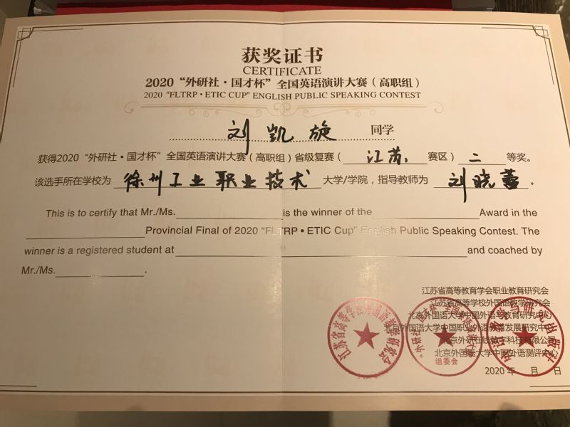 11月13—14日,第十届“外研社·国才杯”全国英语演讲大赛江苏赛区比赛在江苏城市职业学院举行,省内60所高职院校181名选手同台竞技。本次比赛,英语专业和非英语专业学生同台竞技,三分之一的选手来自于英语专业,我校三名非英语专业学生参加了此次比赛,竞争非常激烈。经过激烈角逐,我校李永方老师指导的工程造价192班张景同学和刘晓蕾老师指导的会计194班刘凯旋同学以优异的成绩获得了二等奖,为我校争得了荣誉。