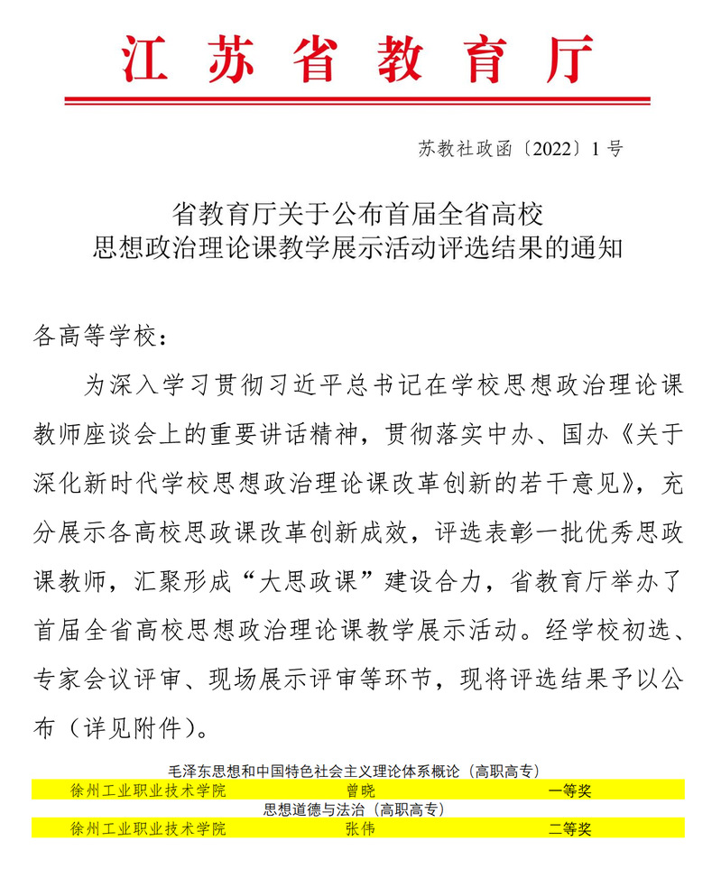 近日,江苏省教育厅公布了首届全省高校思想政治理论课教学展示活动评选结果,我校马克思主义学院曾晓老师获得毛泽东思想和中国特色社会主义理论体系概论(高职高专)组一等奖,张伟老师获得思想道德与法治(高职高专)组二等奖。