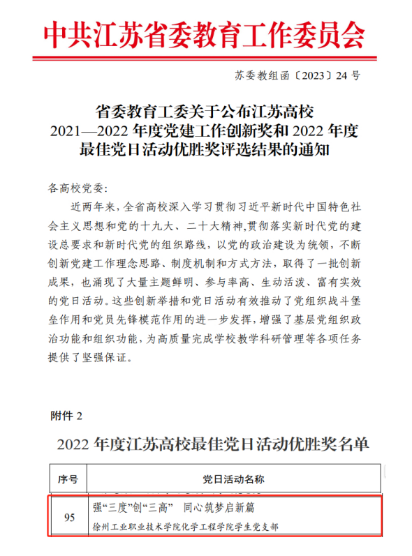 近日,中共江苏省委教育工作委员会下发《省委教育工委关于江苏高校2021-2022年度党建工作创新奖和2022年度最佳党日活动优胜奖评选结果的通知》(苏委教组函〔2023〕24号),经各高校申报、专家组评审、省委教育工委专题办公会议研究,我校化学工程学院学生党支部 “强‘三度’创‘三高’ 同心筑梦启新篇” 党日活动主题鲜明、参与率高、生动活泼、富有实效,获评2022年度江苏高校最佳党日活动优胜奖。